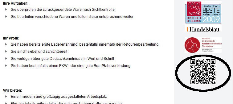 - Wozu wurde ein QR Code in einer Stellenanzeige platziert, die bereits im Internet ausgeschrieben ist? Der Kandidat befindet sich ja bereits online auf dem Stellenangebot.